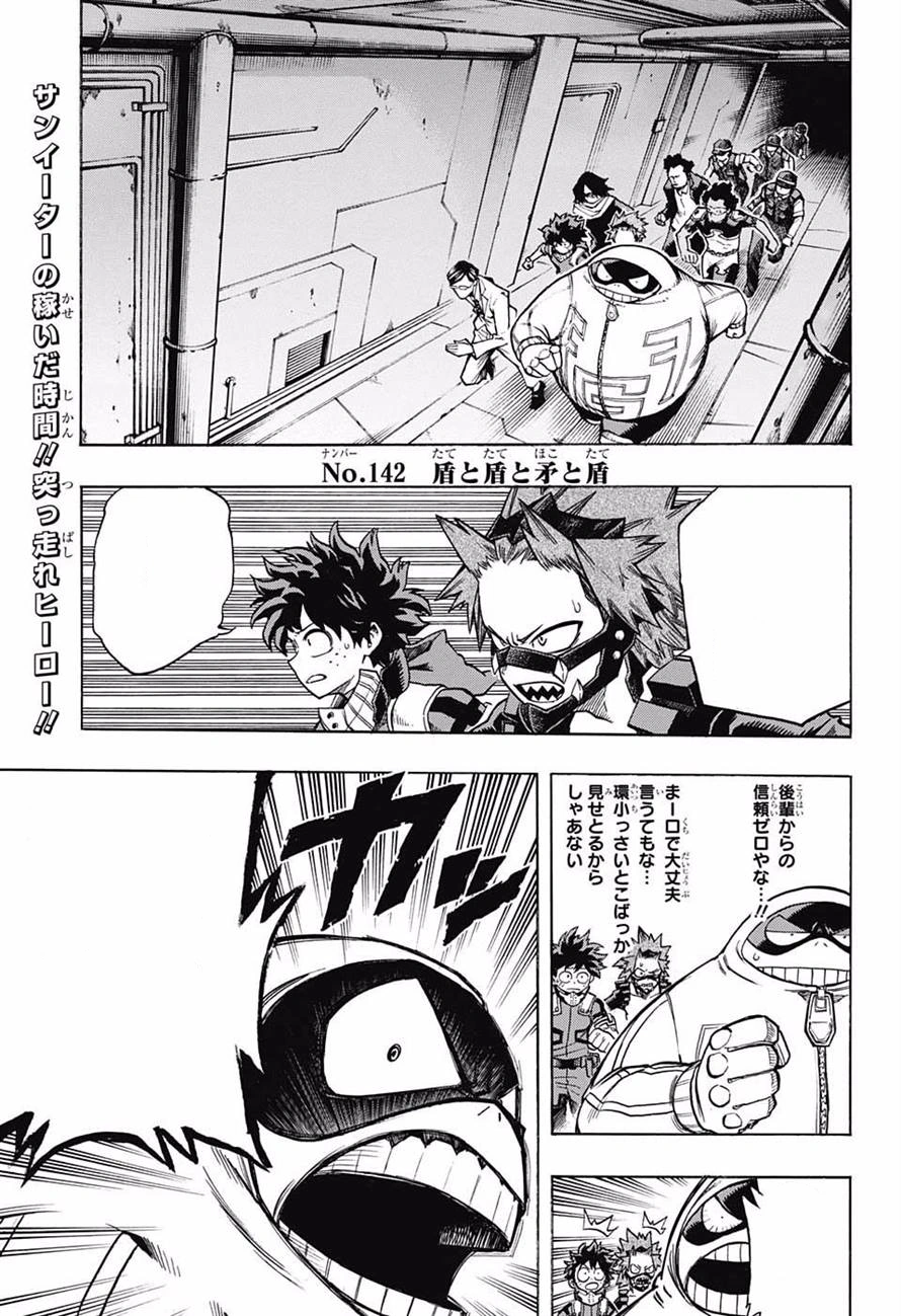 Bouclier et bouclier contre lance et bouclier (盾と盾と矛と盾, Tate to Tate to Hoko to Tate) est le cent quarante-deuxième chapitre du manga My Hero Academia, écrit et scénarisé par Kōhei Horikoshi.