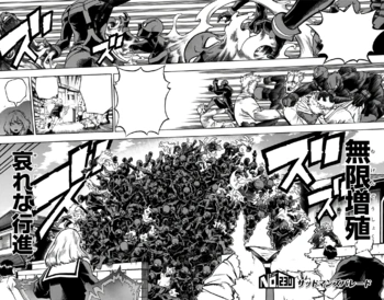 Soudain, des éclats de glace à travers la foule détruisent une grande quantité de clones Twice. Crématorium se rend compte de l’étendue de la manipulation de glace de Apocrypha : il peut contrôler la température de la glace. Apocrypha explique qu’à l’avenir, le rang prévu par l’armée sera lié à la force de son alter et que "la vie au-delà de la seule force n’a aucune valeur". Apocrypha dit aussi qu’il peut sentir la chair brûlante de son adversaire. Il en déduit que Crématorium ne peut pas mener de longues batailles sinon il est consumé par ses propres flammes. Mister Compress, couvert des restes des clones de Twice qui le protégeaient, commence à souhaiter que Gigantomachia se réveille et note comment Apocrypha sacrifie ses compagnons guerriers.