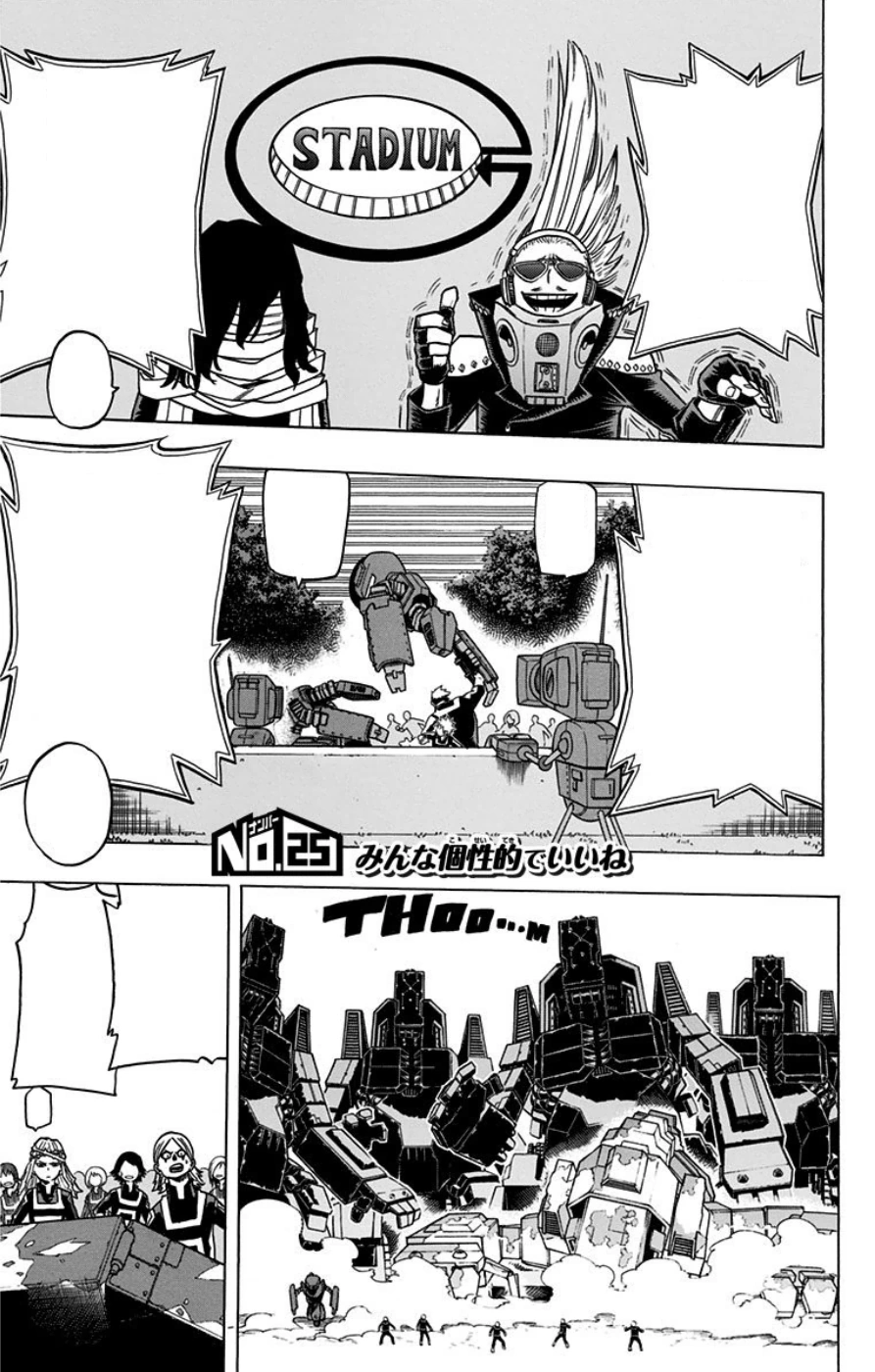Izuku esquive l’attaque d’un robot, puis ramasse un morceau de métal et attend que le robot s’approche. Alors que celui-ci prend de la vitesse, Izuku lui tranche la tête avec le morceau de métal, ne voulant pas utiliser son Alter aussi tôt dans la première phase. Izuku décide de garder le métal comme bouclier et se met à courir vers l’avant, tandis que les autres élèves — dont beaucoup de la classe de seconde A — commencent à dépasser les robots-vilains pour passer à l’obstacle suivant.