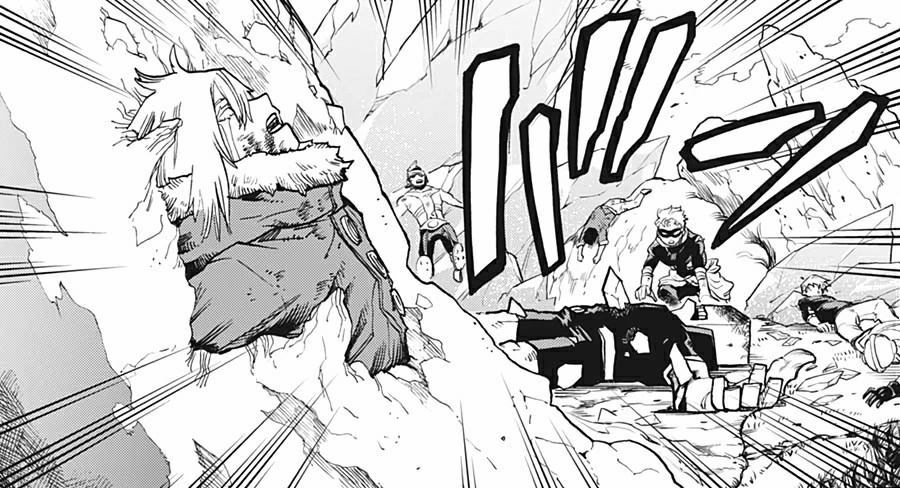 Cependant, les attaques d’Izuku et de Shoto ont frappé les piliers de ciment de Cementos et créé une onde de choc qui détruit toute l’arène. Après que la fumée de la collision se soit dissipée, Cementos commente que même si une grande puissance n’est pas toujours une bonne chose, il trouve Shoto et Izuku tous les deux incroyables.