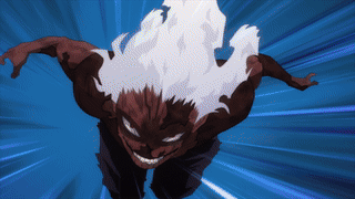 After taking most of the brunt of the damage of the Tiamat missiles, "Tomura Shigaraki" commands the Nomu to Burst, leading to its last remaining bits exploding, creating a distraction against the fighter pilots and allowing "Tomura" the opportunity to catch Star and Stripe off-guard.