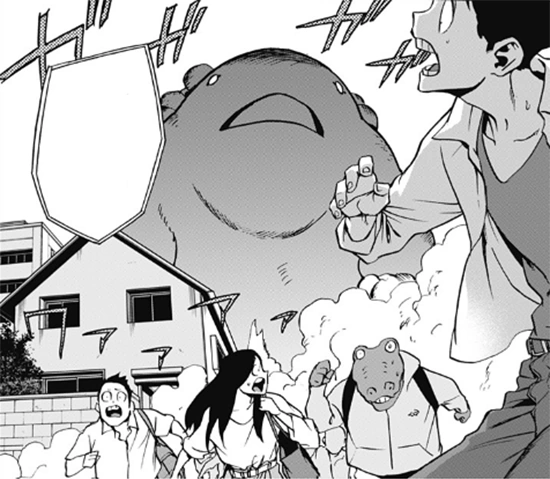 To the heroes surprise, before their massive combined attack impacts Garvey, the villain opens his mouth and absorbs their attacks, including Hizashi's shout, which causes him to numerous lumps to grow on his back. Before the Buster Union can react, Garvey detaches one of the bulges on his back and releases a powerful wave of energy that sweeps a large area of the neighborhood, defeating the entire hero team.
