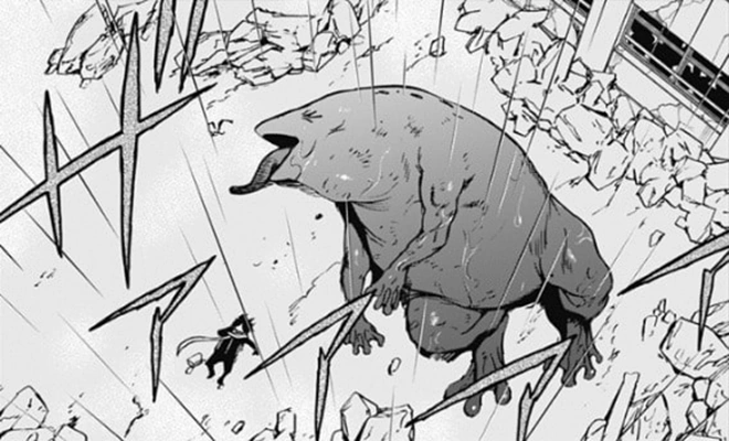 Screaming in rage, Shota pounces on Garvey and deliver him a strong elbow on his left eye. Garvey pushes the student away from him with a swipe, but Shota, while still hearing Oboro’s cheers, uses his Capturing Weapon to ensnare a huge piece of rubble and throws it at Garvey, crushing it in the middle of his face.