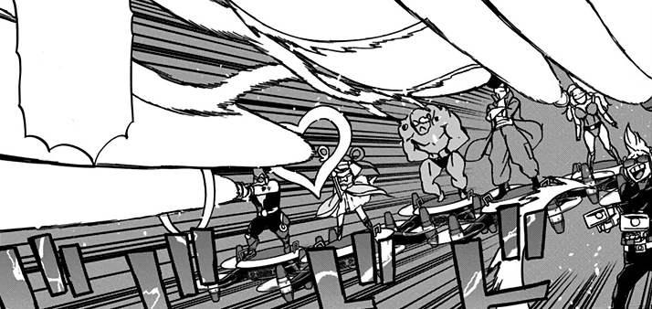 Riding on drones, the Buster Union team arrive to where the villain is, and after seeing his enormous size and the destruction he caused, the leader orders the rest of the members to dispose of him by blasting him with their Quirks all at once, unleashing the full power of their Quirks.