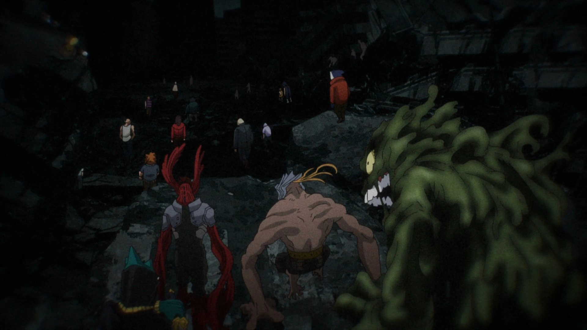 Shortly after the start of the battle, heteropmorph civilians and PLF members begin marching their way to Central Hospital. While police officers are blown away by one heteromorph's quirks, Anima uses his birds to catch the officers and swarm the army. Through the smoke, a gigantic Spinner is about to slam the trainee with his sword, but Tentacole is able grab Anima and evades the attack.