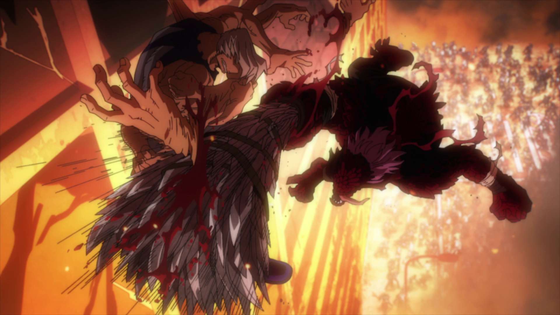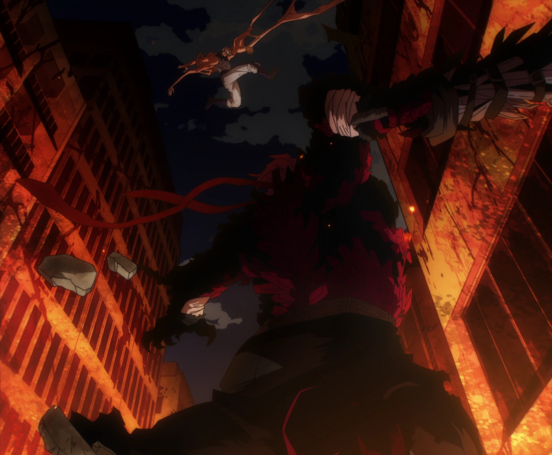 Anima's new horn allows him to control a larger number of animals from a far greater radius, unleashing his Ultimate Move Hitchcock Birds to shove Takaie off the building he was on. At the same time, Tentacole unleashes Octospansion, crashing through Spinner's makeship sword and seriously swiping the hulking mutant in the stomach, even though his jagged Scalemail Quirk. Mic also helps him with his Voice attack.
