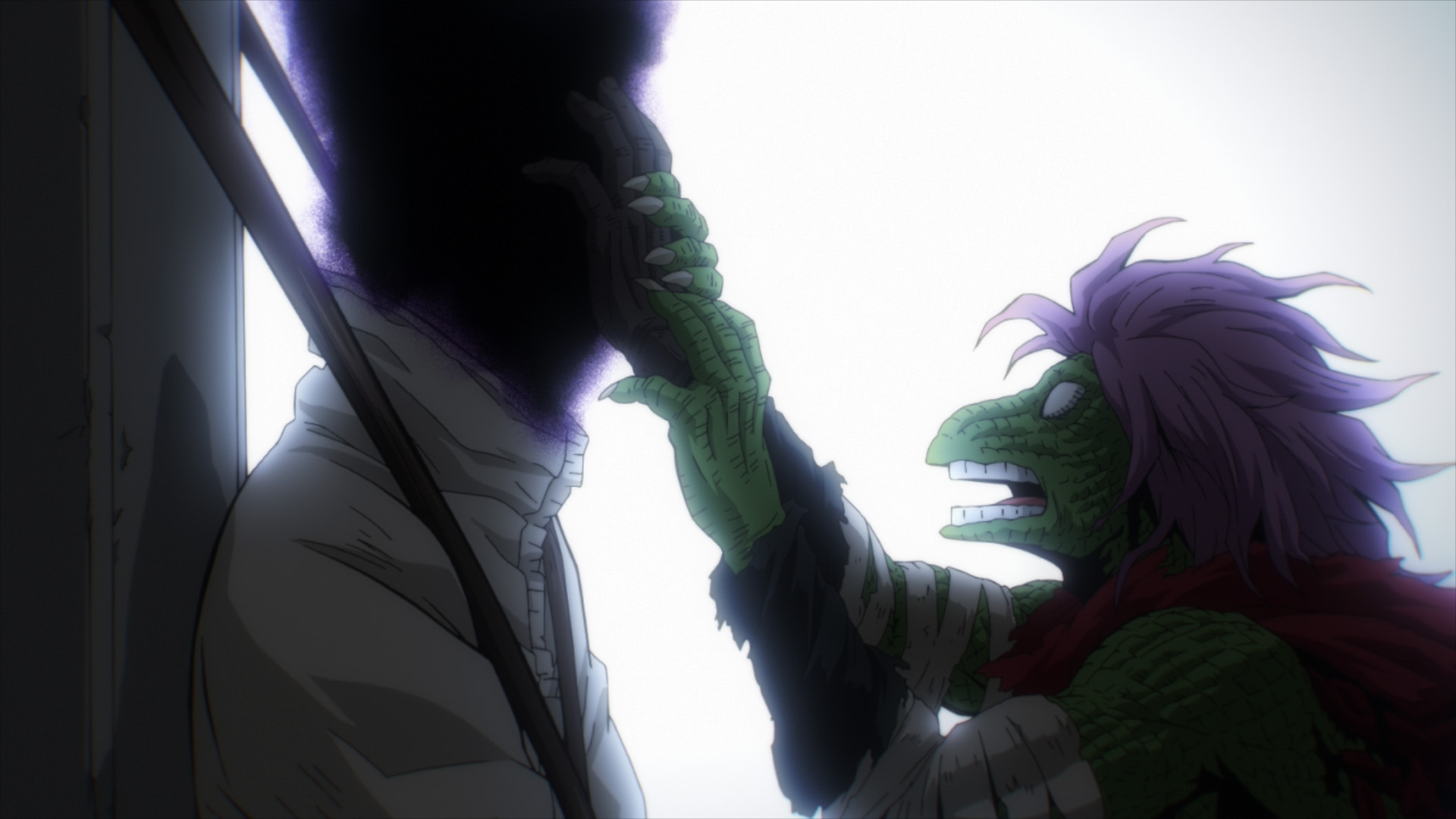 To Present Mic's shock, "Kurogiri" breaks free from his restraints and holds Tomura's hand with his mist. With some of Oboro's features visible on his face, he declares to Present Mic that he is "the protector of Tomura Shigaraki".[5]