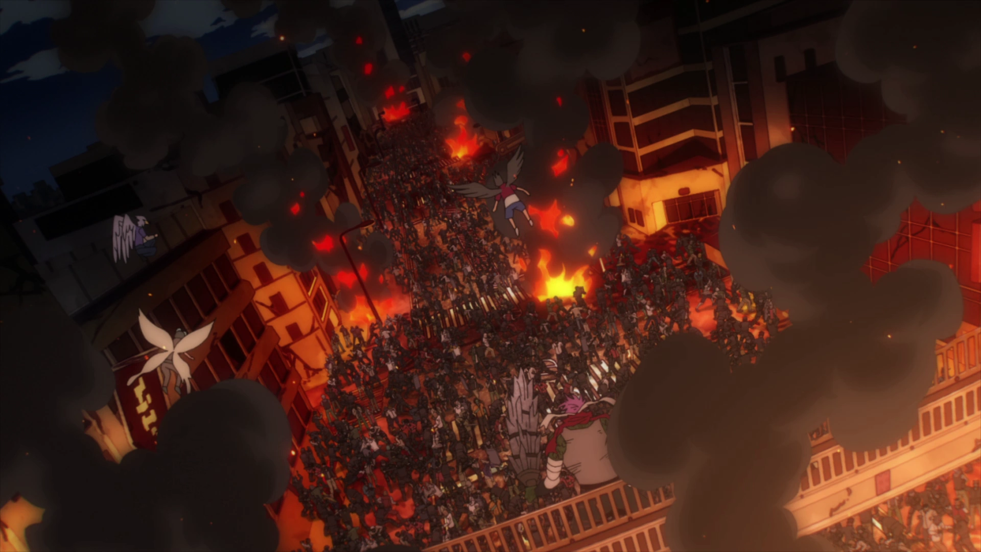 Spinner propels himself from a building toward the Central Hospital. Held up by Anima's birds, Tentacle is shocked that Spinner has gotten even stronger despite the blow, to the point of cracking the concrete with his momentum. His followers hesitate for a moment, but then shout in agreement and follow their leader. The policemen notice that they are more fired up and seem to deem it necessary to use firearms.