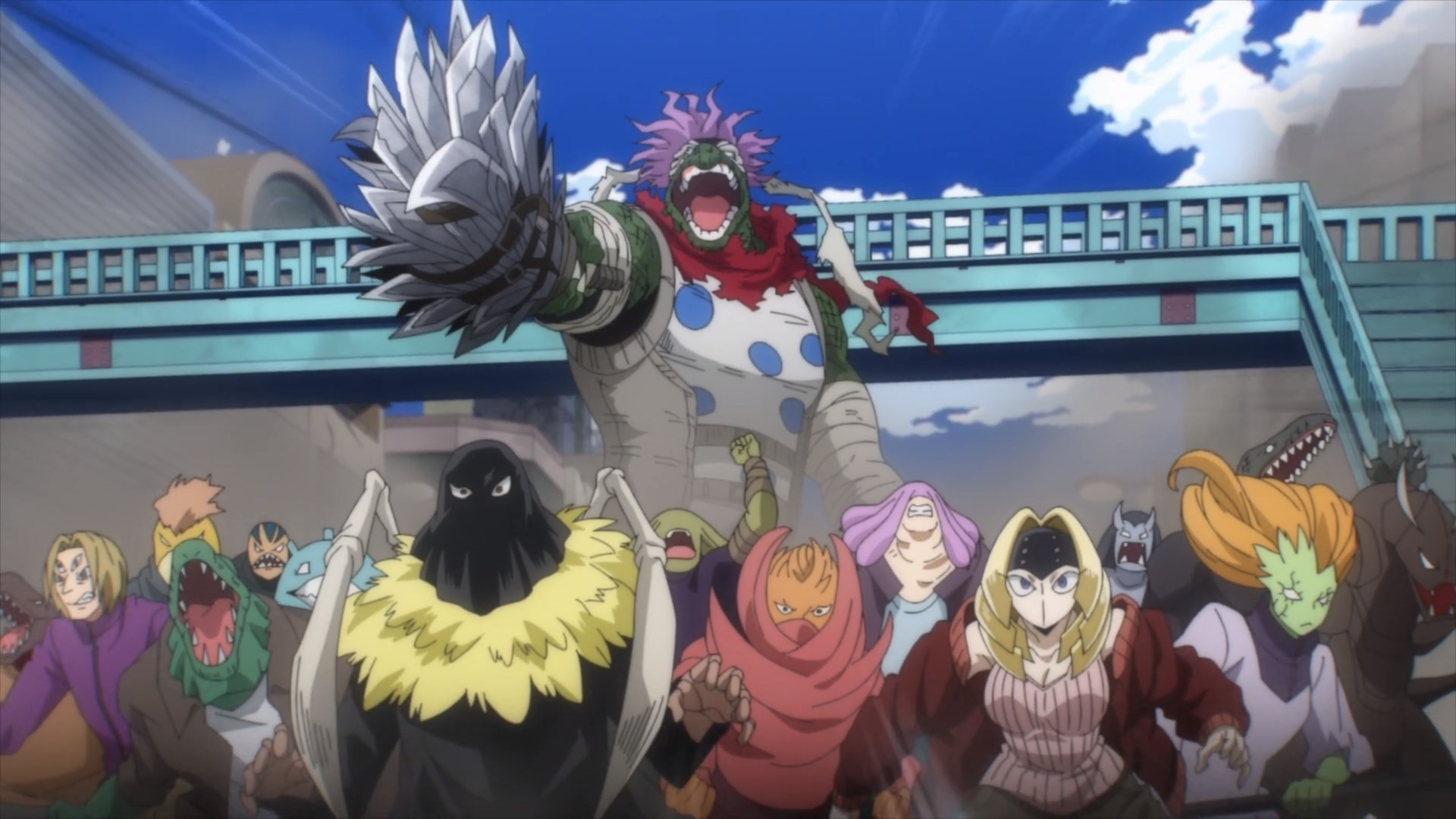 At the top of a building, Takaie Kanigumo, the Paranormal Liberation Front's Support Regiment adviser, addresses himself to all the mutants, giving a speech about how they are mistreated by society, that the Quirk Counselling and education are useless, reminding them of various atrocities committed against them, and that in many places mutants are still despised even if they try to give the impression that things have improved.