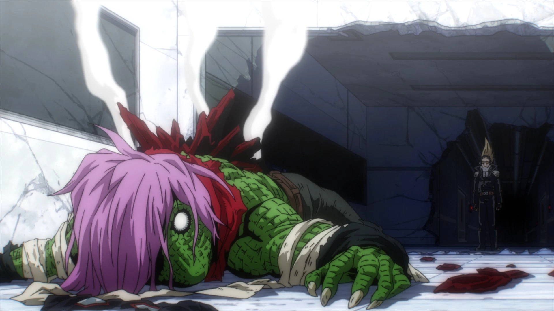 As those who had followed Spinner leave the hospital without the strength to continue fighting, the pig-faced mutant who saved Tentacole says that maybe they are using their anger in the wrong way. Takaie held down by Anima calls out to them not to stop and to keep following their spokesman, reminding them how the system mistreats them.
