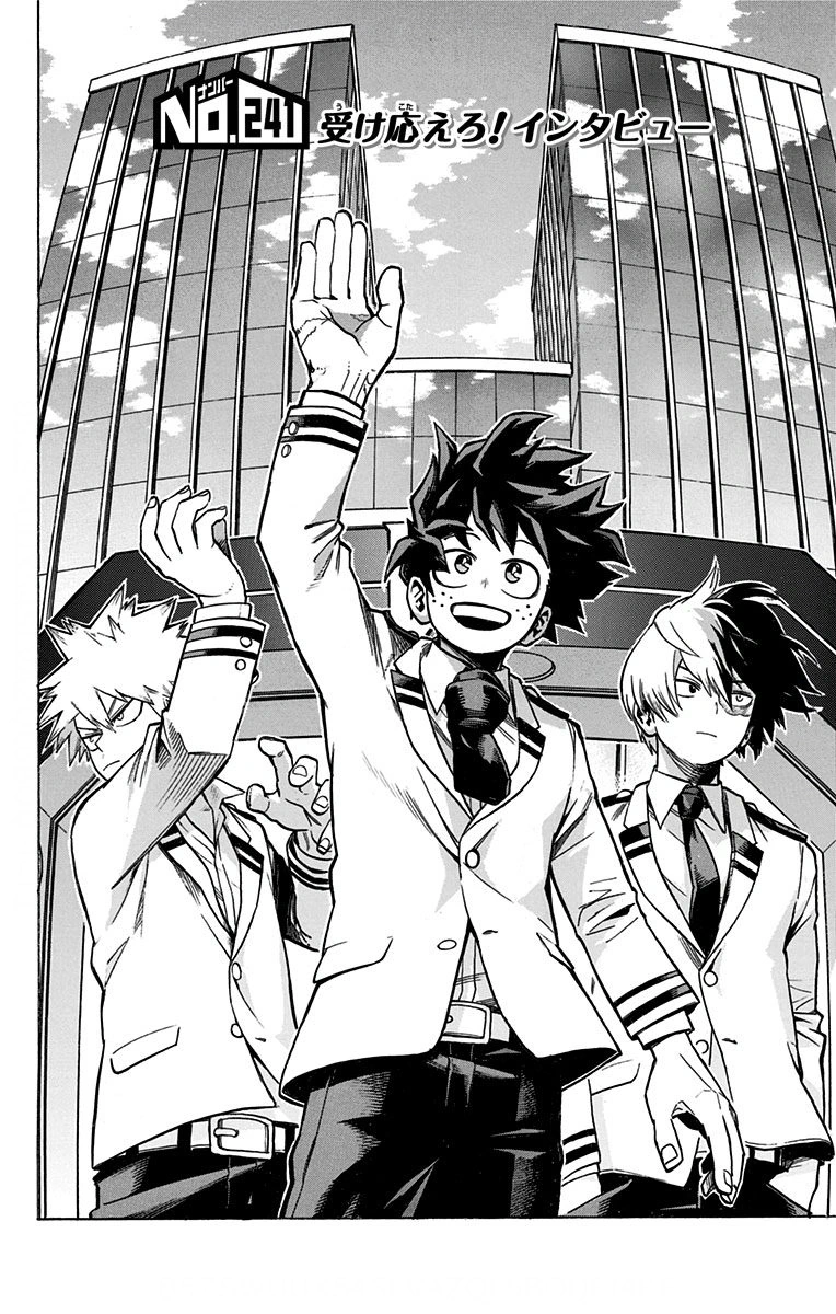 Fumikage Tokoyami wonders if the students should reveal their special moves during interviews. Mt. Lady then answers him by stating that ultimate moves symbolize a hero's true demeanor, and shouting out attacks isn't just for show-offs. Shota adds that not only did Mt. Lady change but also every hero out there are trying their best to show who they are. With that being said, everyone's interviews turn out fine student after student. However, Katsuki ends up flopping his interview with his explosive behavior. Midnight and Shota agree that Katsuki is better off following his path instead of interacting with the media.
