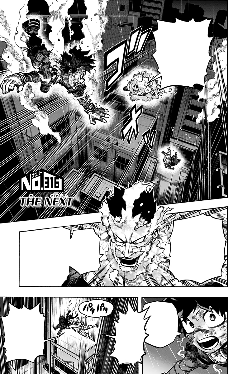 Endeavor finally arrives on the scene, telling Deku that All Might gave him a call and apologizes for being late because he gets slowed down in the rain. He asks for a status update but Hawks interrupts them calling for help, as he still can't fly easily yet. Deku is able to catch him with Blackwhip but can't pull them up because he is out of strength. He is able to tell Hawks that Lady Nagant had received a Quirk from All For One, and it must have come with a trap which is why she exploded.