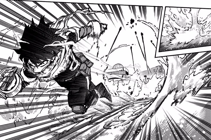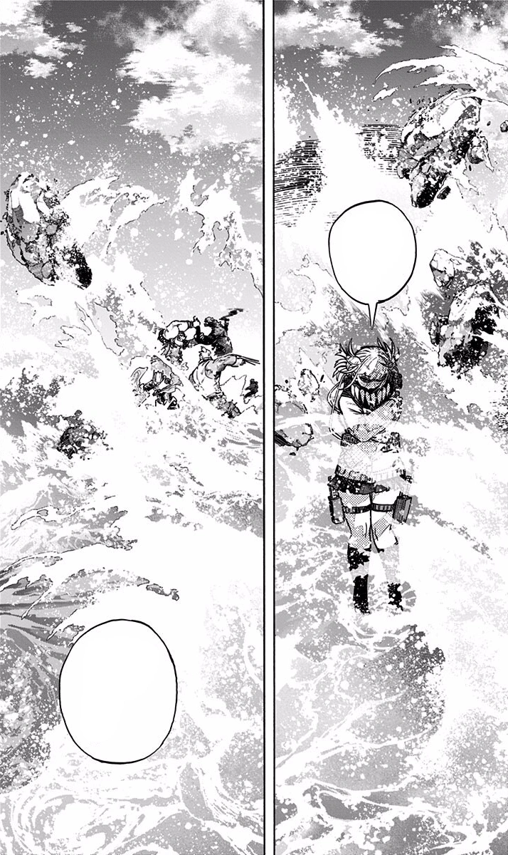 As another shockwave from the Nomu occurs, Himiko asks Deku what he wants to do with her, the same question she asked Uravity during the War. When Himiko once again hides her presence to come in for an attack, Deku says that he too wanted to become like All Might, and that he understands her, and how fulfilling it feels. However, he proceeds to say he could never share the same heart and mind as her or think about hurting the ones he loves. Hearing this causes Himiko to think back to the words of her parents, Curious, and Uravity, and her face twists once again.