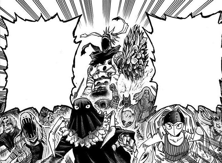 At Central Hospital, Present Mic announces that Shoto defeated Dabi, while Tentacole saves Anima from a gigantic Spinner. Spinner can't believe it, calling it "information warfare," before recalling back to when Dabi refused getting more power from All For One, while Spinner accepted it. He thinks about how Dabi had everything, including a purpose, goal, and power, while he had nothing. Commanding the heteromorph army, Spinner declares there's no way someone like him could've lost, and orders them to get Kurogiri back, and destroy their status quo, for him and Tomura's sake.