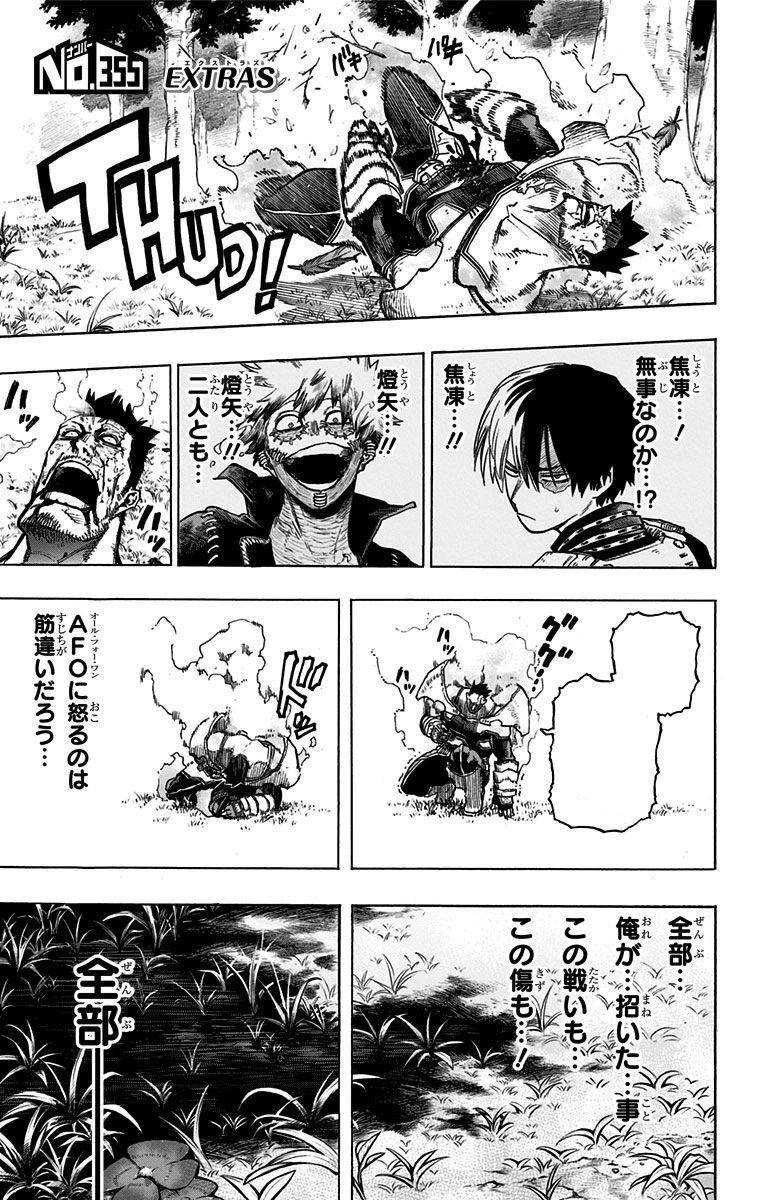 Endeavor lands on the ground right after being impaled by All For One. He thinks about Shoto and Dabi before attempting to regain his bearings, lambasting himself for letting All For One get to him like that, and thinking about how everything he's had to deal with he's brought on himself.