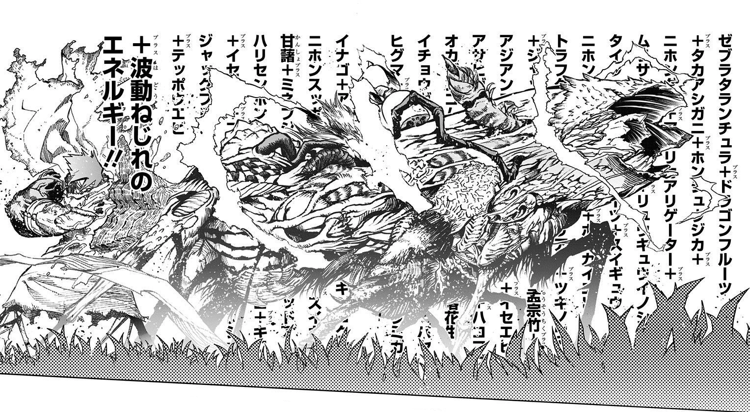 Nejire Chan shoots her Wave Motions directly toward Suneater which he absorbs, as he prepares to unleash the true potential of his Manifest Quirk and his "Vast Hybrid", releasing every one of the animals and plants he has eaten into one ultimate fusion, thinking about the words of encouragement from his friends as motivation.