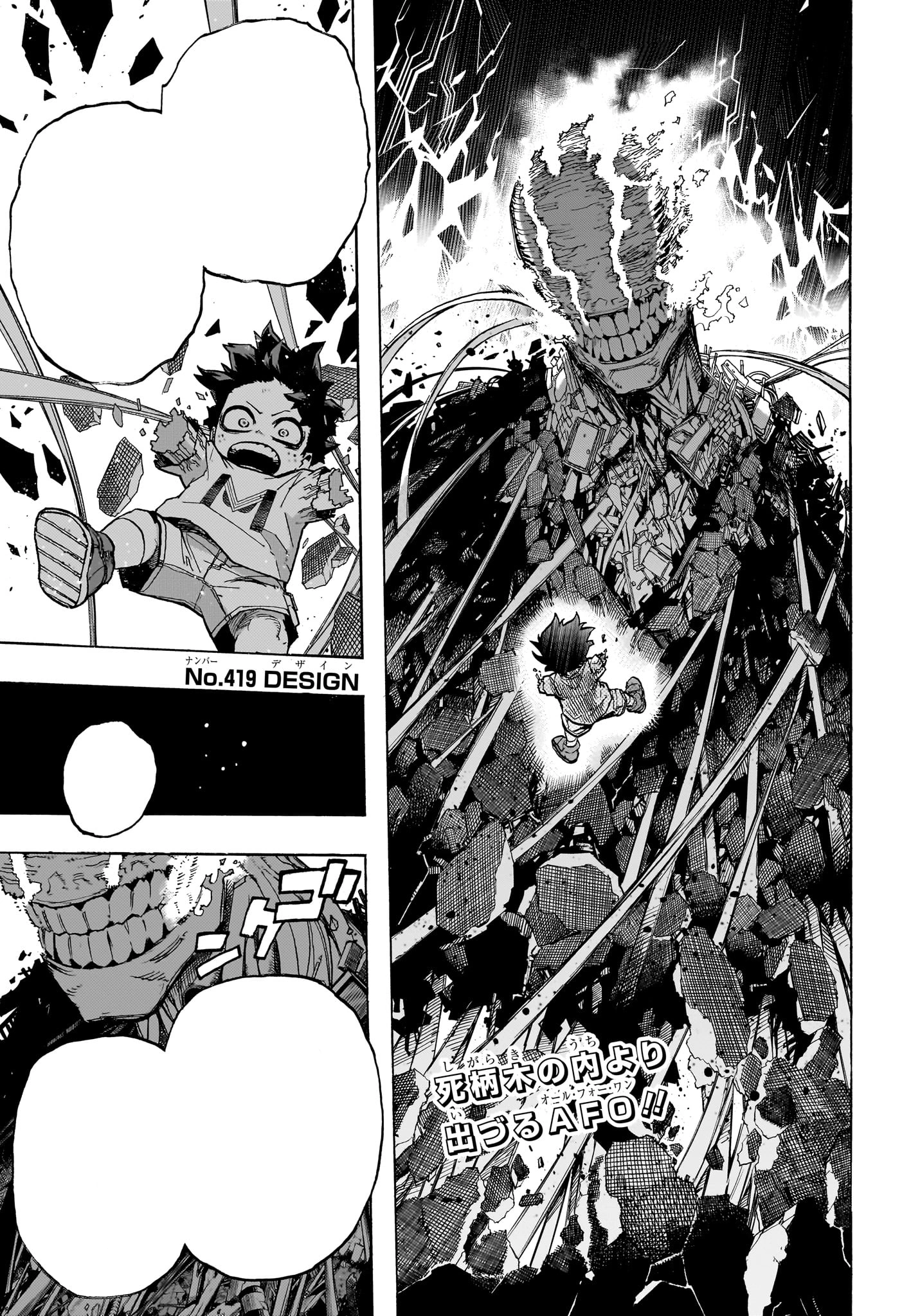 "All For One", now back in control of Tomura's body, laments that Yoichi is gone, so his intermediate plan is fouled. A screaming voice of a lingering memory continues to ring in his head, so he forms a version of one of Tomura's stuffed hands over his mouth to silence it. "All For One" examines the body, noting the spiritual damage has taken its toll, that Tomura's anger and hatred are gone, along with Decay. With the vessel he searched for and cultivated over years now ruined, and his little brother gone, he decides there is nothing left but to move onto his hollow final goal, world domination. A recovering Izuku calls out to All For One, declaring that he won't let him, only to fall forward onto himself, realizing both his arms are completely destroyed.
