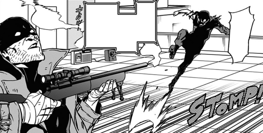 Knuckleduster continues aiming at the head of Number 6. With his investigations, he deduced that the next move of the Villain Factory would be attacked the Tokyo Sky Egg event, to use it as a testing ground. He looked for what would be the ideal rooftop to provide the best view of the Sky Egg in case he decided to observe the attack, and then search for the ideal spot to snipe him. When he is about to shoot him, a bird passes in front of his scope, causing him to miss the shot, piercing the speedster villain's left shoulder. Knuckleduster tries to shoot him again, but the villain quickly locates him, and despite his injury, he jumps from building to building thanks to his Quirk until he ends up on the rooftop where Knuckleduster is.