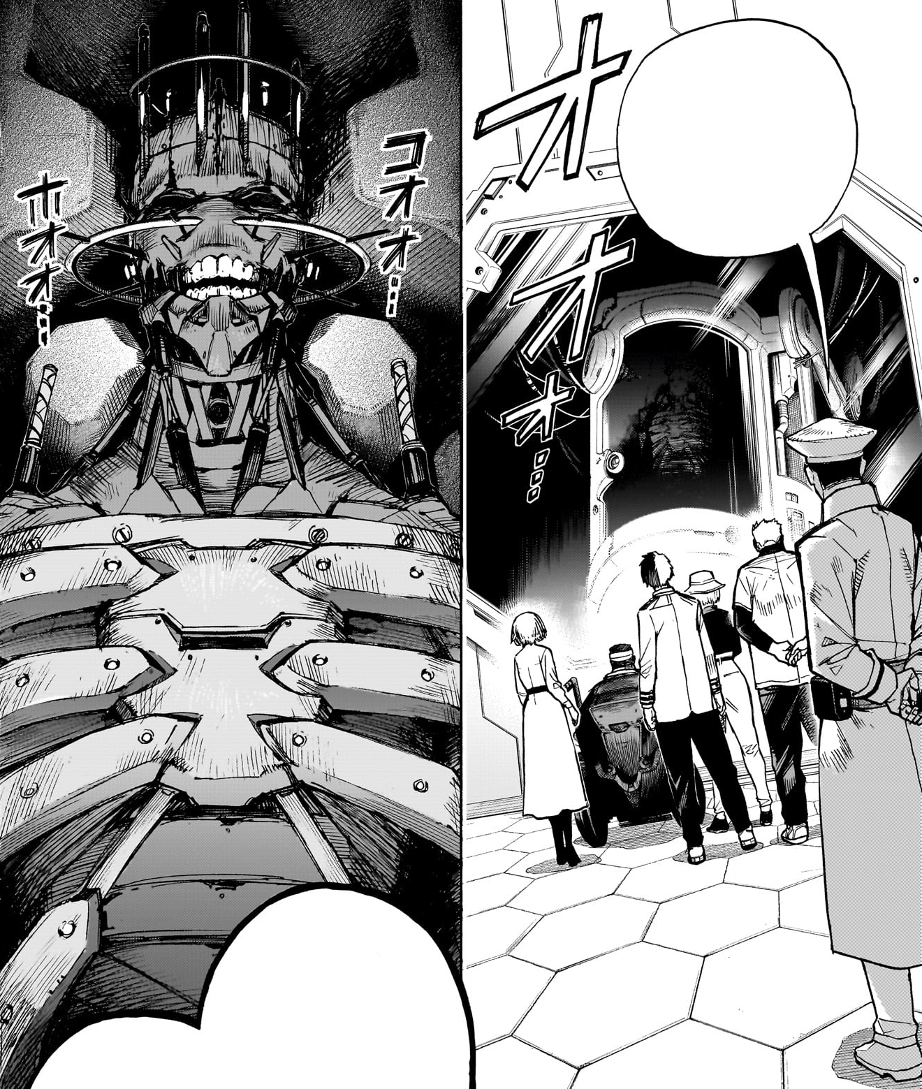 They're interrupted by an intense rumbling that brings the villains outside. The League of Villains come face to face with a giant claiming it's searching for All For One's successor. Dabi questions the identity of this titan and Tomura claims he's the secret weapon Kurogiri got captured trying to retrieve. The giant quickly overpowers the League, while the voice of All For One's doctor plays from the beast's radio which hangs around his neck.[34]
