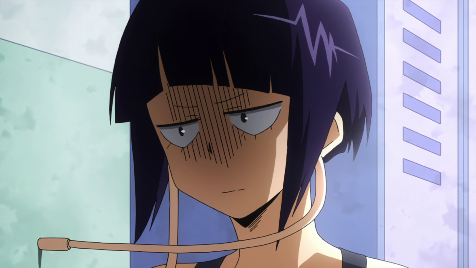 Hero Basic Training ends and Class 1-A return to the locker room to change. In the boys' locker room, Minoru tells Izuku that he found a hole in the wall. He is deeply excited by the idea of peeping into the girls' locker room. Tenya reprimands Minoru for his behavior, but Minoru decides to look through the hole anyway. However, Minoru's eye is stabbed by Kyoka's earphone plug. In the girls' locker room, Momo, Toru, and Mina are annoyed with Minoru's antics and thank Kyoka for stopping him. Kyoka notices that during Minoru's rave about all the girls, she was the only one he failed to mention, thus feels dejected.