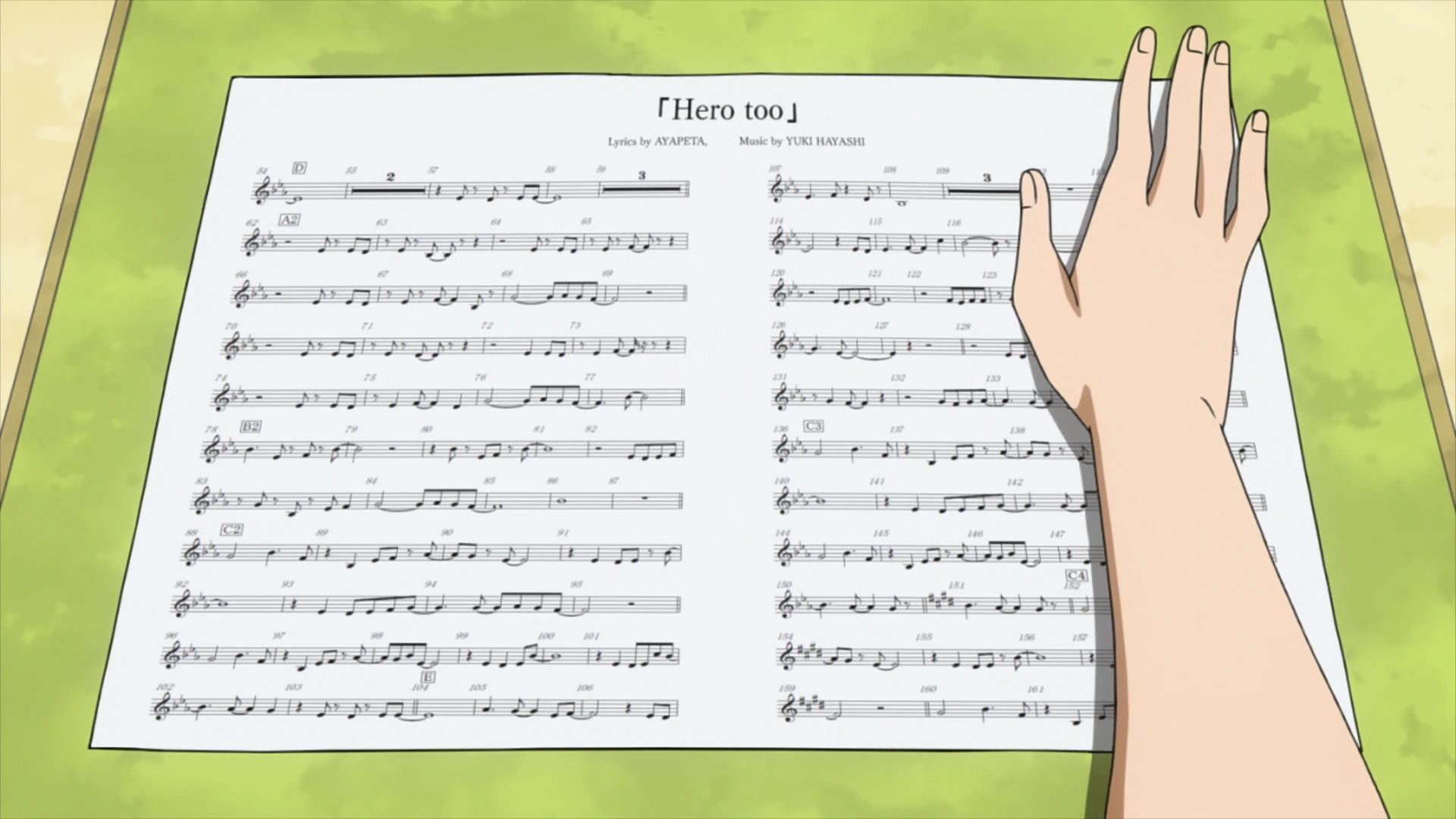 Hero too is a track from the fourth season of the My Hero Academia anime that is composed and performed by the students of Class 1-A during the U.A. School Festival Arc. The song itself is performed by Chrissy Costanza, the lyrics were written by Ayapeta (あやぺた) and Yuki Hayashi, with the latter composing the music. It was made available on the My Hero Academia 4th Original Soundtrack album.