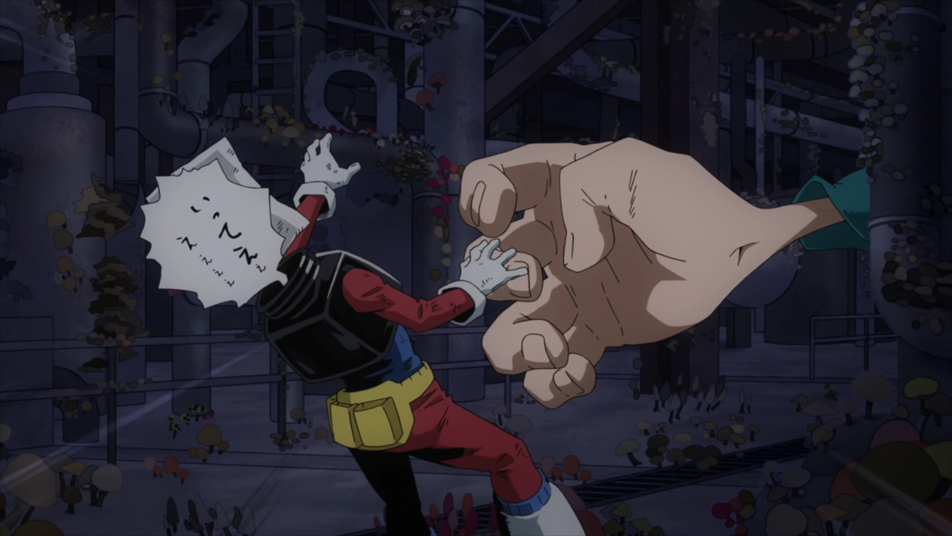 Shihai reports Kinoko that he has already put Yuga in the cell, when he suddenly sees Fumikage approaching them. Before both 1-B students can react, Fumikage attacks them with Black Abyss: Sabbath, defeating them. Fumikage has Dark Shadow restrain Kinoko while he traps Shihai in his cape. Before he can do anything, Fumikage starts coughing, as it's revealed by Kinoko that she has mushrooms growing in his lungs, to which Neito comments that Fumikage should have knocked Kinoko out from the get-go.