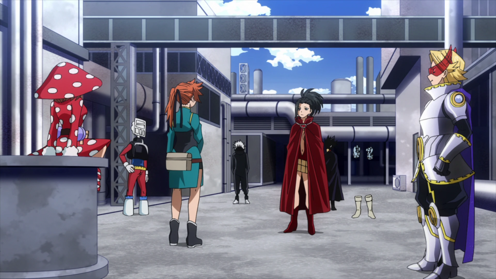Now dressed in their winter outfits, Class 1-A gather at Ground Gamma and share the modifications made to their costumes. Tenya points out how much the costumes have changed, but Rikido notices that Tenya himself has kept the same costume over the summer. Izuku notices Katsuki's costume changes and talks about it, putting Katsuki into a rage. Mashirao comments on Izuku's costume, bringing up the glove upgrade that Mei made for him, causing Ochaco to remember Izuku and Mei's encounter back when they were remodeling parts of their outfits together, resulting in a flushed outburst, much to Mashirao's surprise.