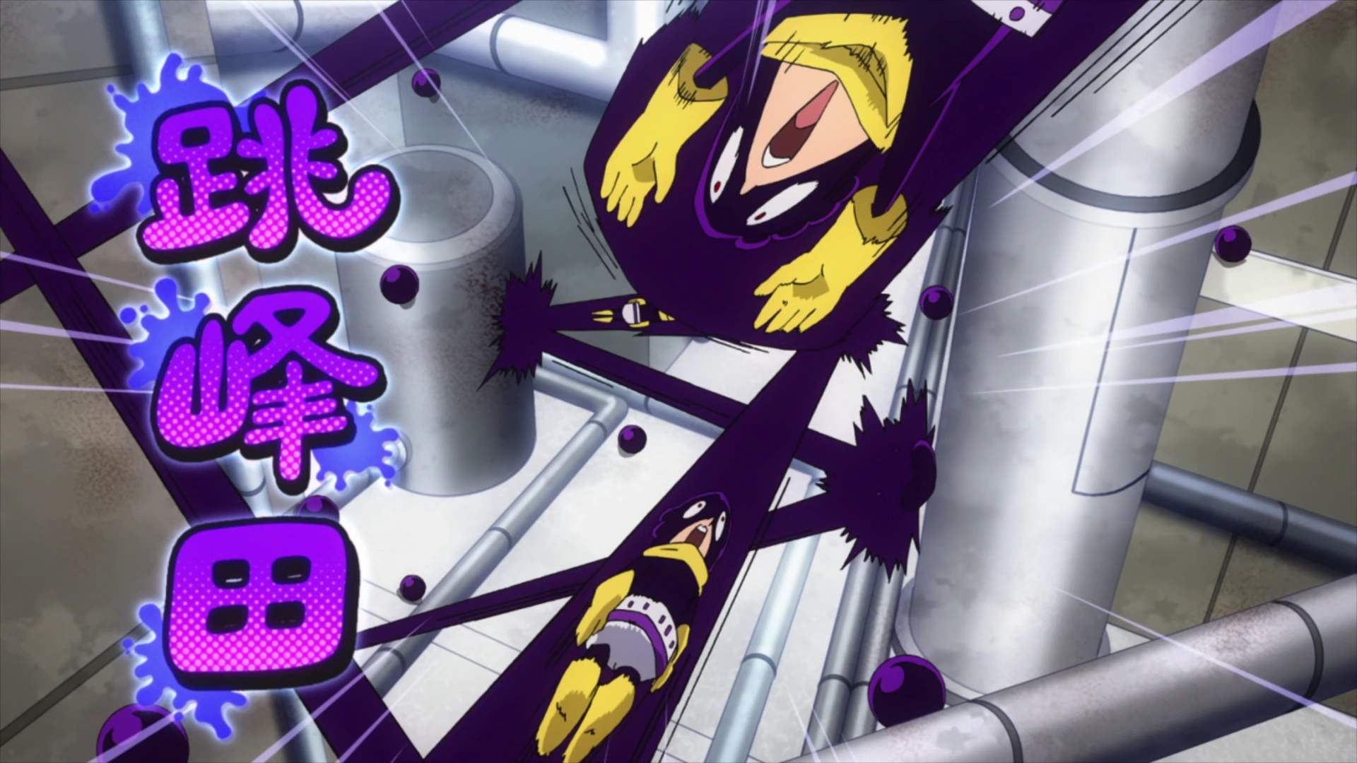Momo yells out to her 1-A team to keep calm and regroup, but Manga uses his Comic Quirk to spawn a large, wall-like string of Katakana suddenly appears, cutting Momo off from the rest of her team. Yuga tries to blast the Katakana with his laser, but he cannot damage it. Manga then spawns the onomatopoeia for humidity to help Kinoko's mushrooms grow faster.
