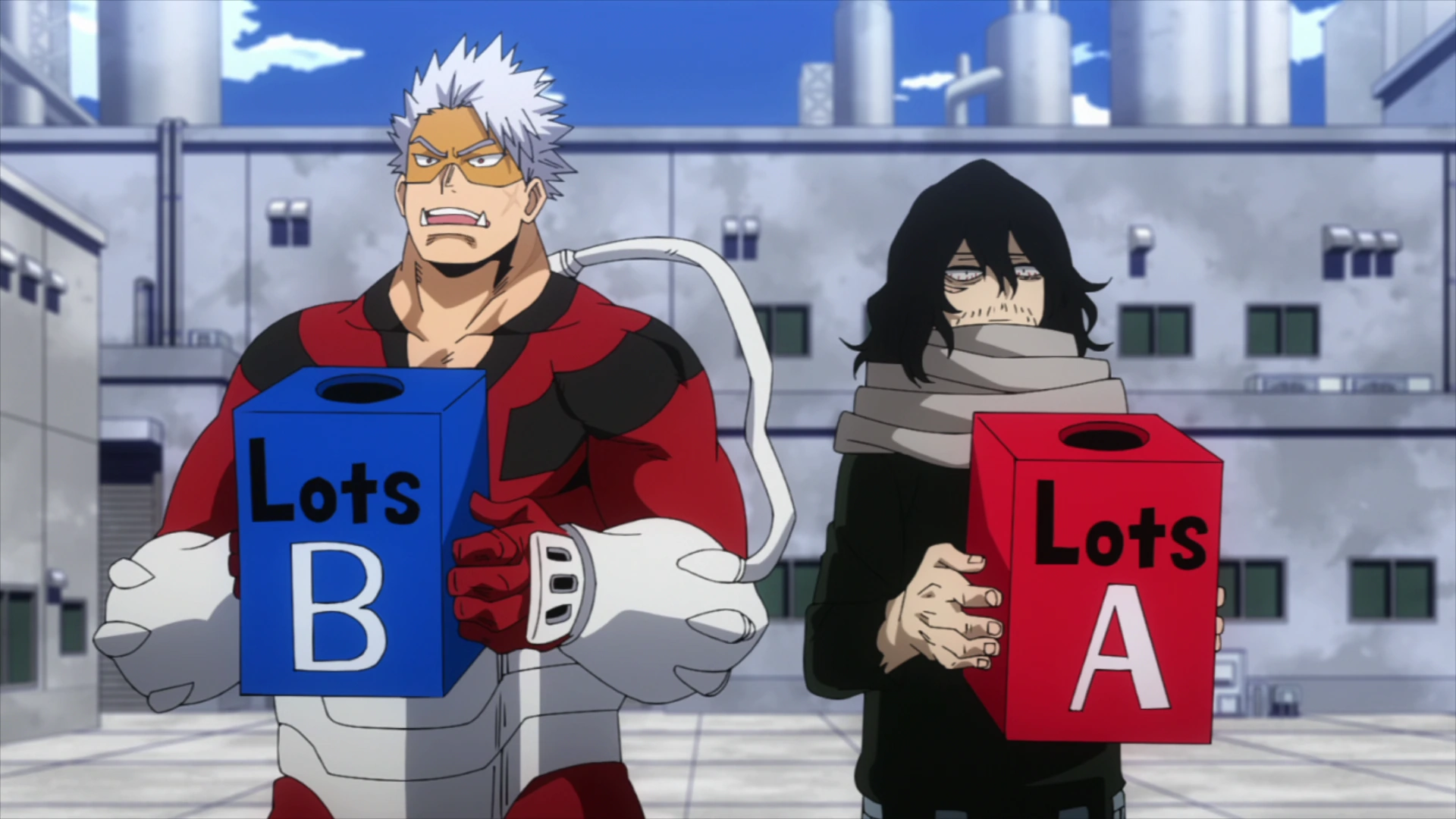 Clarified the situation, the two teachers decide to form the teams of both classes by lottery: Class 1-A consists of Team Asui, Team Yaoyorozu, Team Ida, Team Bakugo, and Team Midoriya and Class 1-B consists of Team Shiozaki, Team Kendo, Team Tetsutetsu, Team Tokage, and Team Monoma.