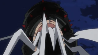 Shoto says he'll create light with his fire to stop Dark Shadow but Katsuki tells Shoto to wait. Moonfish picks himself up using his teeth and demands Dark Shadow stop stealing his prey. The villain attacks with his bladed teeth but Dark Shadow easily immobilizes with its claw. Dark Shadow says Moonfish is nothing but an insignificant bug and crushes him in its hand, breaking most of his teeth. Katsuki watches on in delight and says Dark Shadow must finish him off. Dark Shadow slams Moonfish through several trees and throws him across the forest, defeating the villain in an instant.[4]