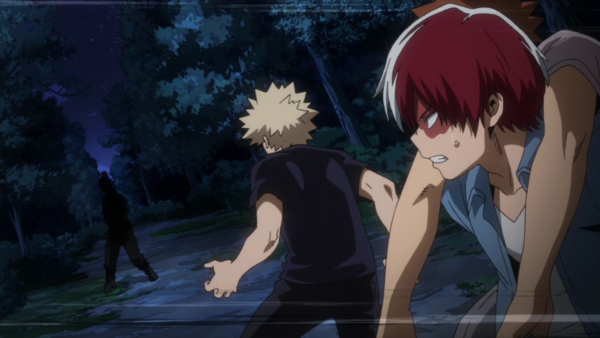 Dark Shadow continues to rage and desires to create more havoc. Katsuki and Shoto swiftly activate their Quirks and run beside Fumikage. The light produced from Shoto's fire and Katsuki's explosion clams Dark Shadow back into its weakened state.