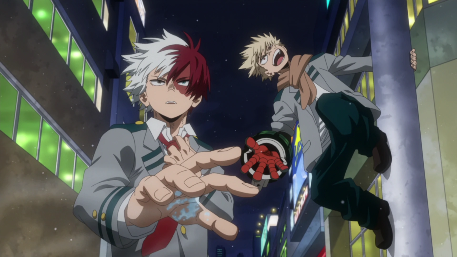 Realizing the situation is worsening by the moment, Shoto rolls up his left sleeve and decides he has no choice but to get rough. He aims his flames at the villain and blasts him with a Ultimate Move: Flashfreeze Heatwave. Shoto comments that heat eliminates carbonation and Katsuki adds that this is the same move Shoto used to defeat Izuku in the Sports Festival. Shoto claims he toned down its power in this case.
