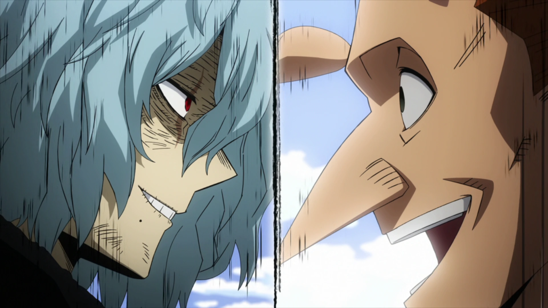 Re-Destro attacks Tomura with Stress Output Burden.