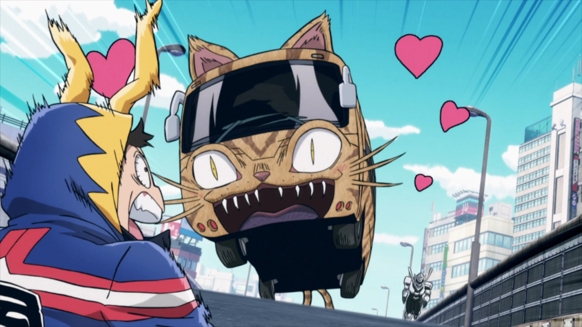 Monster Cat first appeared during a sightseeing trip in Tokyo, when Koichi was accompanying his mother Shoko and friend Makoto Tsukauchi. As they prepared to return home by bus, the stray cat boarded the vehicle and was unexpectedly injected with Trigger by one of Kuin Hachisuka's bees. The drug activated and amplified the cat's Quirk, allowing it to fuse with the bus and transform into a sentient, animalized vehicle. This fusion turned the cat into a dangerous living bus, soon dubbed Monster Cat, which began to swerve uncontrollably through Tokyo's streets.