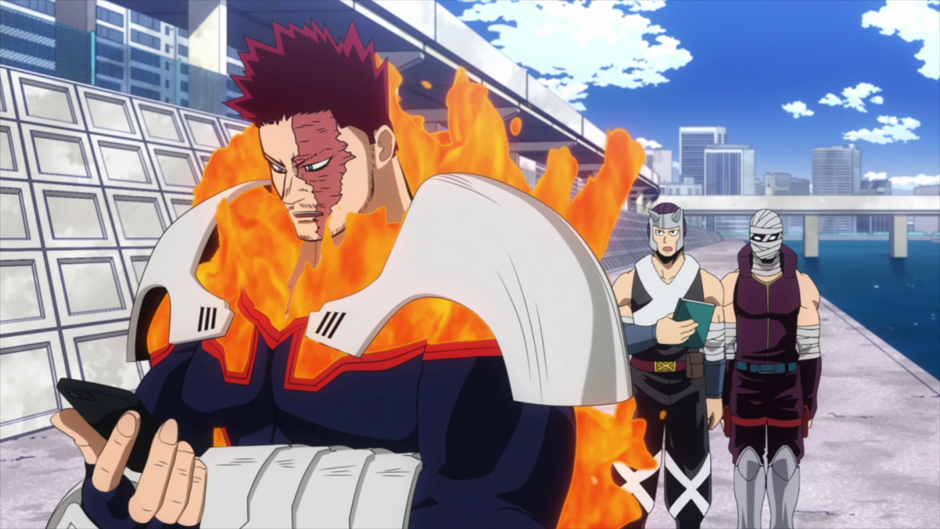 Burnin, Untenmaru, and the Flaming Sidekickers waiting for Enji.