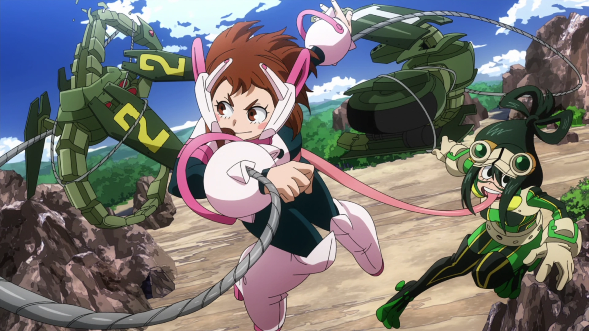 Class 1-A begins their class as they show off all their new moves and techniques they learned during their Work Studies. Yuga Aoyama shows off a brand new Ultimate Move: Navel Saber, using it to destroy several U.A. Villain Bots, much to the delight of his classmates. Toru jumps into battle, revealing her new ability to grab and warp light, grabbing one of Yuga's laser beams and bending it into a group of Bots. As she explains her new powers to her classmates, Mina jumps in using her new Ultimate Move: Acidman, to defeat the remaining robots.
