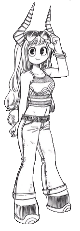 Pony is a short girl with a round face and a short equine muzzle, framed by thick, wavy blonde hair that reaches halfway down her back, with shorter bangs hanging down her forehead. Her eyes are large and round, Prussian blue, and she has a pair of tall, lyre-shaped pale tan horns on her head. Her calves are notably rounded, shaped similarly to those of a horse, and she has brown hooves, and a short horse tail poking out from the end of her tailbone.