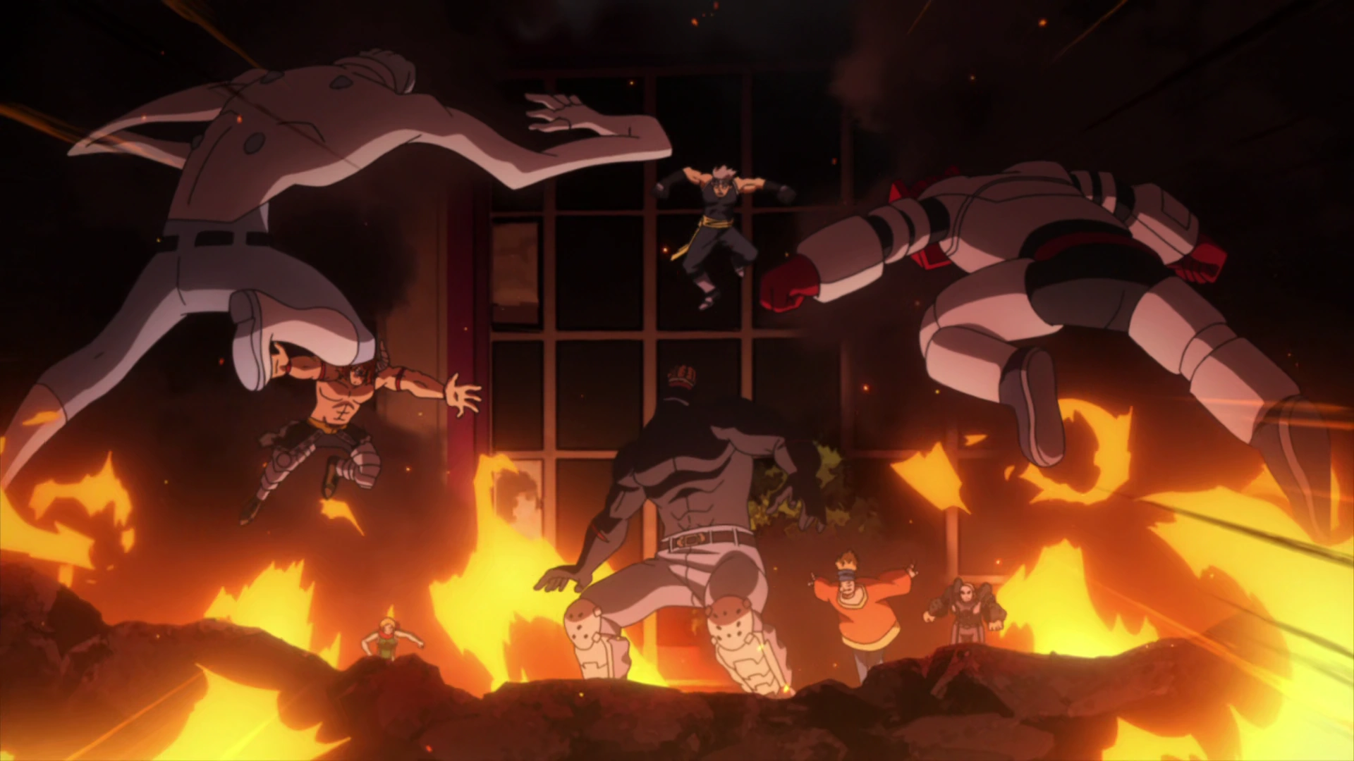 Despite the power and enormous strength of the Nomu, the heroes continues to struggle them for several minutes. The dark Nomu attacks ninja-like heroes, who dodge his blow with a jump and counter-launch by throwing shuriken's at him, though the weapons bounce off the creature's sturdy back without doing any damage to it.