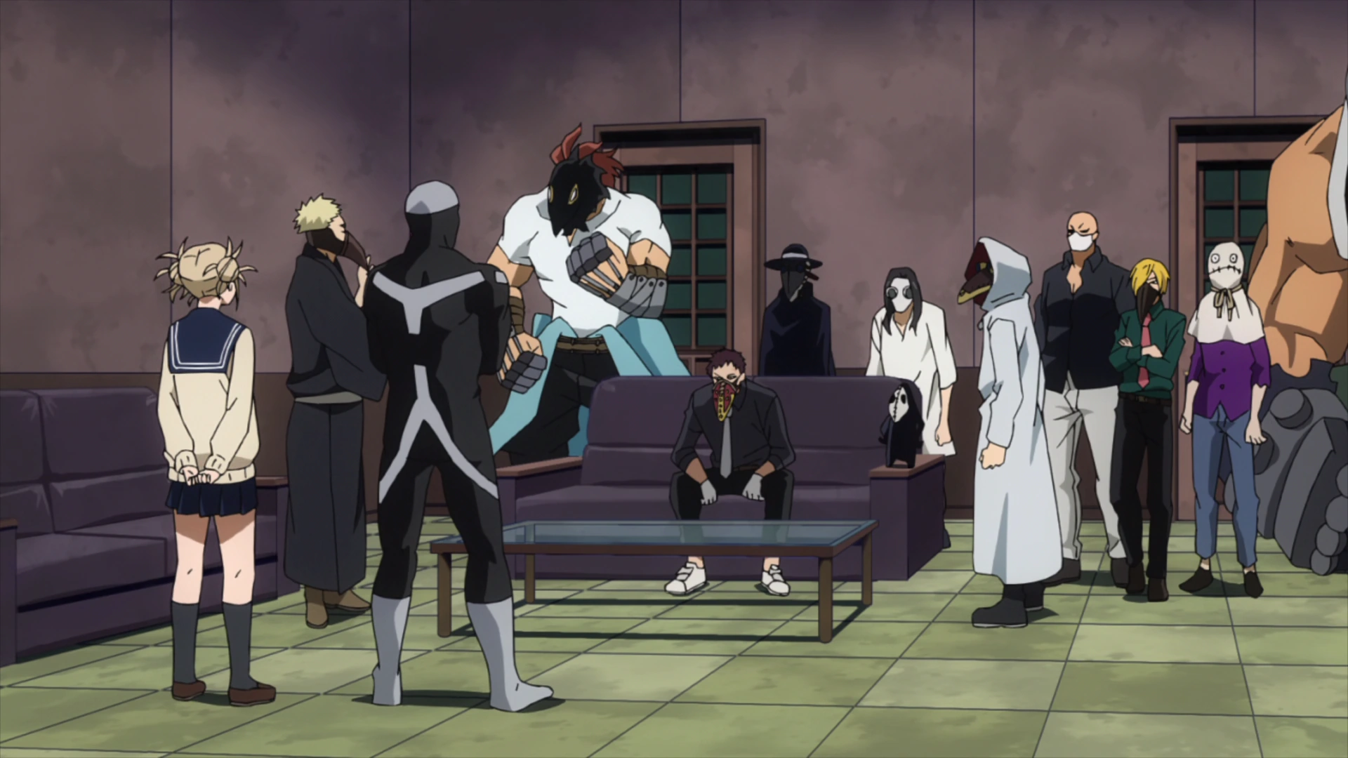 Overhaul and Twice have arrived at the League of Villains' hideout and come to face Tomura Shigaraki and his fellow League of Villain members: Magne, Mr. Compress, and Himiko Toga. However, Overhaul is unimpressed with the League of Villains "hideout", calling it run down and does not like the quality of the League of Villains. Magne wonders why Overhaul is critical of them. Tomura responds that the man standing before them is Overhaul, the yakuza and the leader of the Shie Hassaikai.