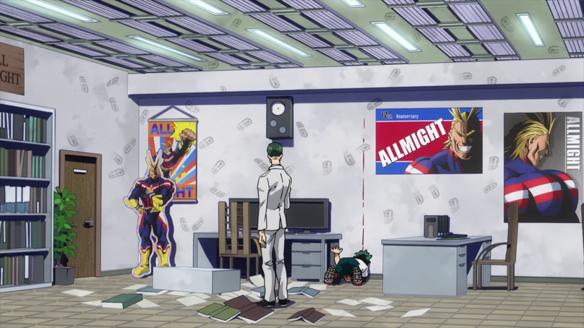 Izuku tells Nighteye that he was careful while moving around because he did not want to step on the 10-Year Anniversary Commemorative All Might Hero Tapestry. Nighteye looks around his room and sees that the All Might memorabilia is unharmed and realizes that Izuku was avoiding them while jetting around like Gran Torino. Nighteye is surprised that Izuku was moving about and evaluating his surroundings and countermeasures against him while he was under emotional distress.