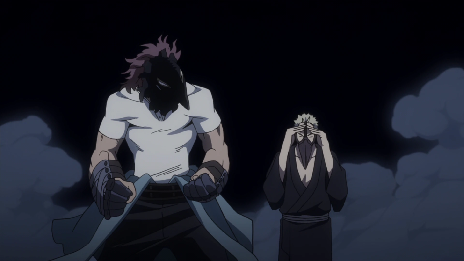 Overhaul apologizes to Izuku for his daughter's behavior because she gets carried away with her fun and games. Mirio arrives and tells Izuku that he forgot to put his mask on, causing Izuku to put his mask on. As Mirio apologizes to Overhaul, Izuku is aggravated by his mistake of letting Overhaul know that he and Mirio know each other, which will make Sir Nighteye's job more difficult. Izuku acts innocuously to correct his mistake while Mirio identifies Overhaul as a member of the Shie Hassaikai due to his mask, to which Kai states not to pay heed to his mask as he simply dislikes dirt.