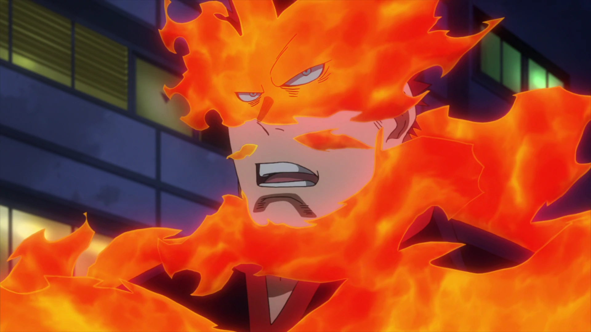 The Nomu survives Endeavor's blaze. The Flame Hero is surprised because his low-temperature warning shot almost always defeats his opponents. Gran Torino notices something off about the beast and then evades when it releases flames from its body. Endeavor simply swipes the flames away and surmises that the Nomu's Quirk is Absorption and Release. He notices that it still took damage from his flame and admits he's unimpressed with the power.