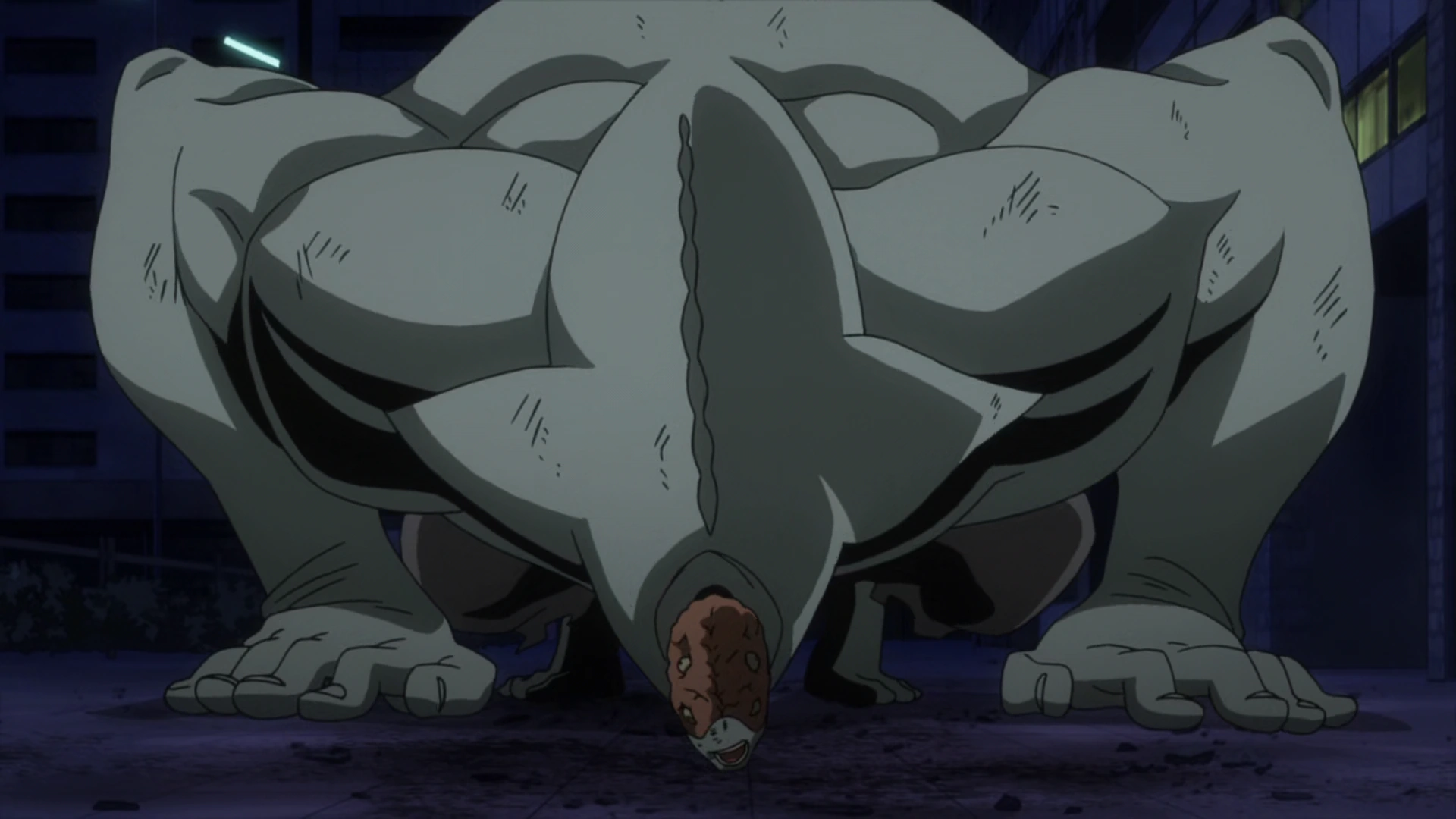 The Nomu recovers and escapes the building before attacking two nearby civilians. Gran Torino stops it by kicking it, enjoying his chance to fight earnestly again. Nomu tries to punch Gran Torino, but the old pro is too fast and evades him. Gran Torino commends the monster's speed even though he knows it's not faster than he is.