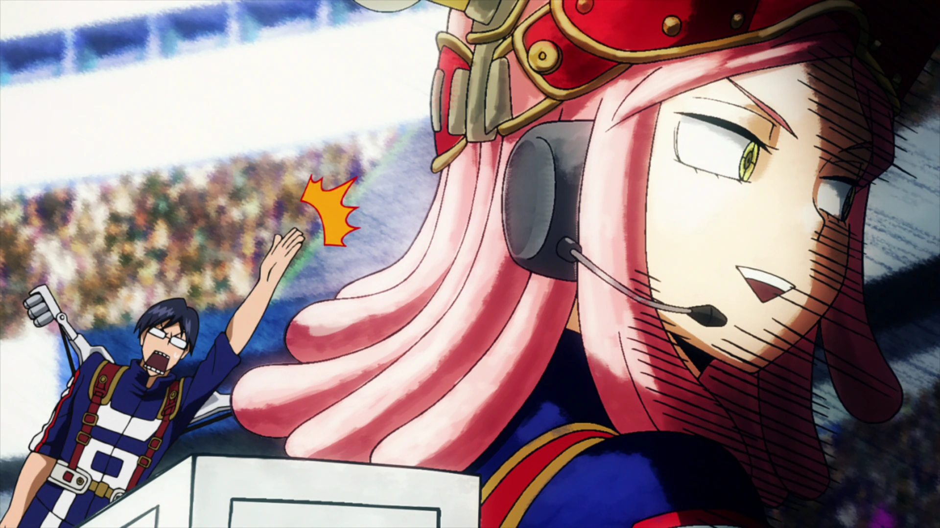 Tenya runs at Mei and she turns on her mic and explains she gave Tenya special leg braces to improve his mobility. He is confused by Mei's action but keeps running towards her. Before he gets too close, Mei avoids him with hydraulic attachments from her backpack as she explain to spectators how it works. Mei uses her Quirk to look at the spectating support courses, and she is happy to see that they show interest in her gadgets. Tenya tries to take advantage of her distraction, but she has sensors on her backpack that automatically activate her hydraulic attachments. Tenya trips over the attachments, but the Auto Balancers on his back allow him to keep from falling and easily change his course back towards Mei.