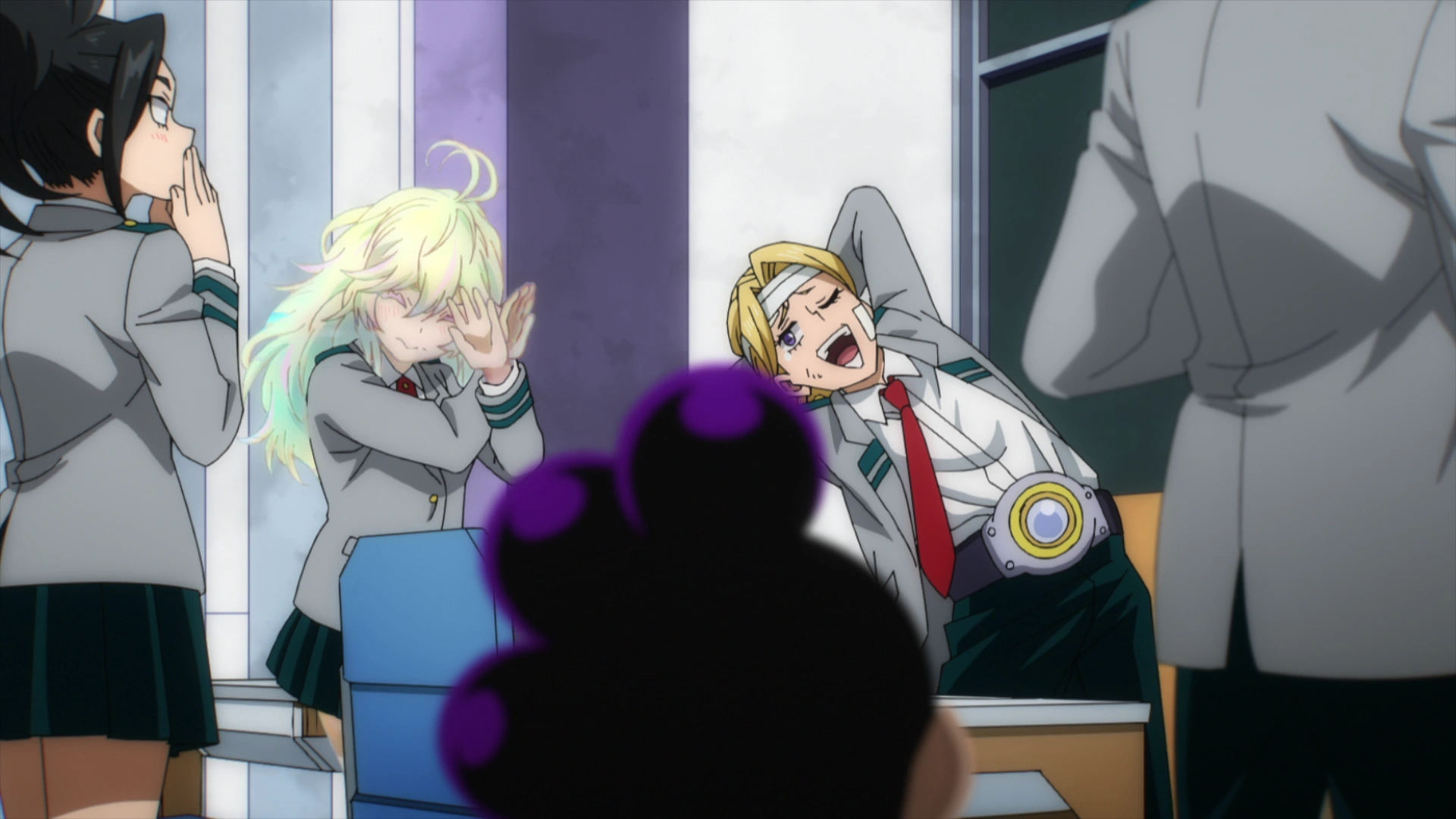 Weeks later, after the police raid at the base of Shie Hassaikai, Izuku, Eijiro, Ochaco and Tsuyu return to their dormitories at the school, where Toru, along the entirety of Class 1-A, is checking to make sure his classmates are doing okay, after their mission. Toru hugs Ochaco and Tsuyu after checking that they are fine.[41]