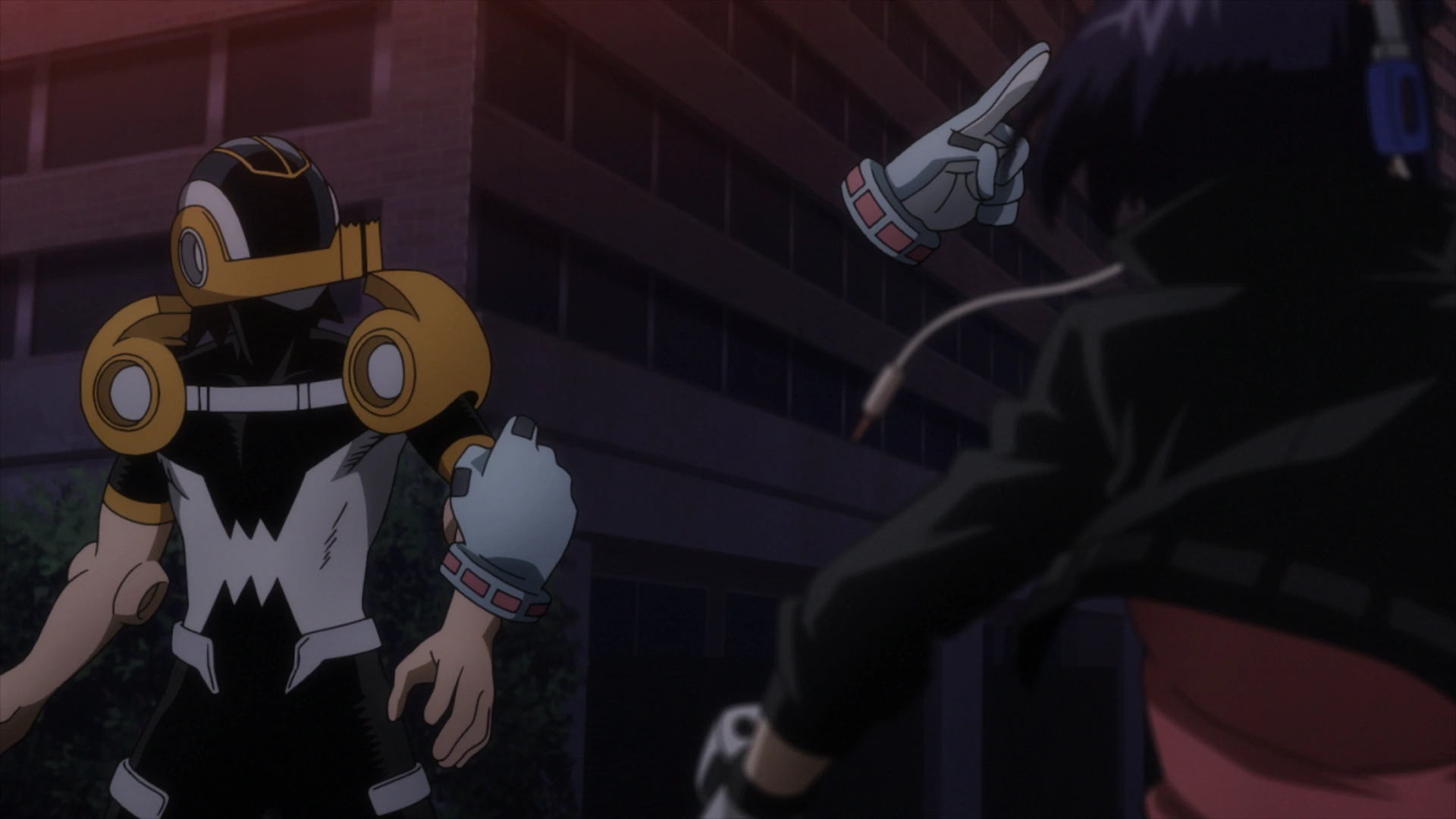 Shihai moves through the shadows of the mushrooms and takes Yuga again. Fumikage tries to pursue but Manga knocks him down with text bullets. He recovers and is shocked to find Invisible Girl covered in mushrooms. They hear a cannon shot and notices Yaoyorozu's Lucky Bag flying over the wall created by Manga. Fumikage grabs Toru and flies up to the bag. Inside he finds ethanol to get rid of the mushrooms and infrared goggles. By the design of the glasses, Toru deduces that they are for Fumikage.