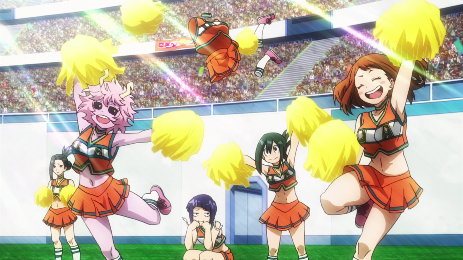 After Denki Kaminari and Minoru Mineta state that the girls must do the cheering battle as per orders from their homeroom teacher, Toru and the other girls of Class 1-A walk out in cheerleading outfits. However, as Toru and the girls walk out, they realize they have been tricked. Toru optimistically says that they should do it until the next event begins since they have time and being stressed about it would be tiresome. She then starts cheering, leading to Tsuyu to comment that she likes cheerleading.[11]