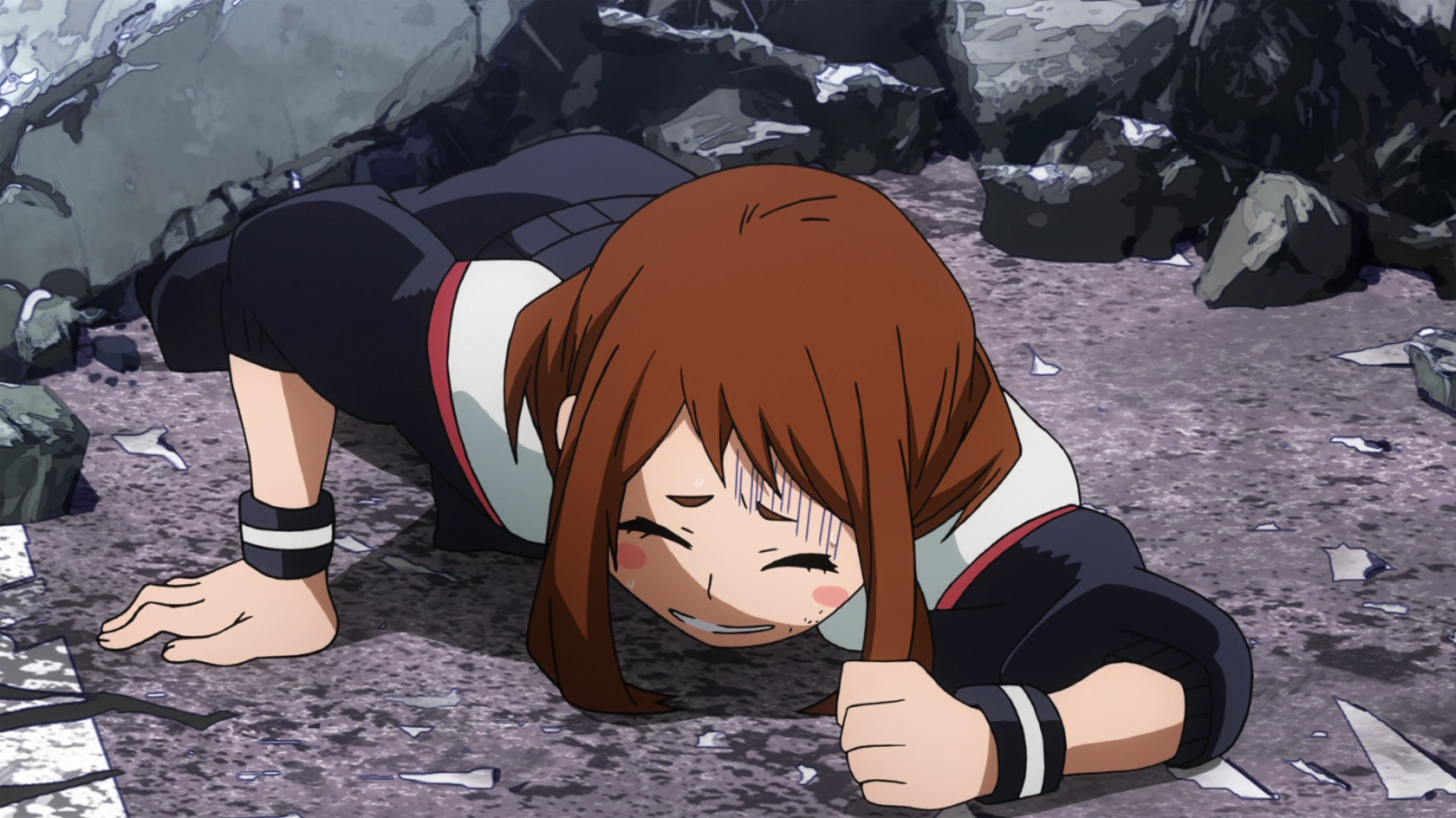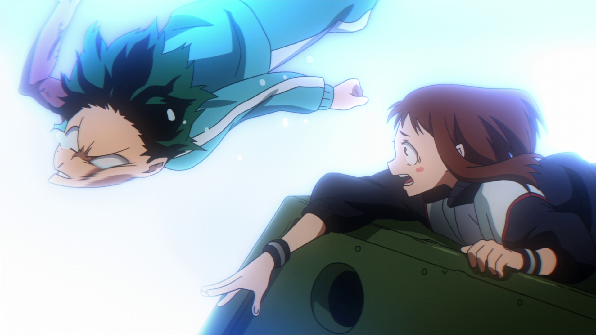 Fortunately for him, Ochaco returns the favor by saving Izuku from a life-threatening fall. She had managed to free herself in time and immediately use her Zero Gravity Quirk to float herself up towards Izuku on some debris, then used her Quirk on Izuku to stop the fall and save him, to then gently land both on the ground and suffer the side effects of her Quirk.